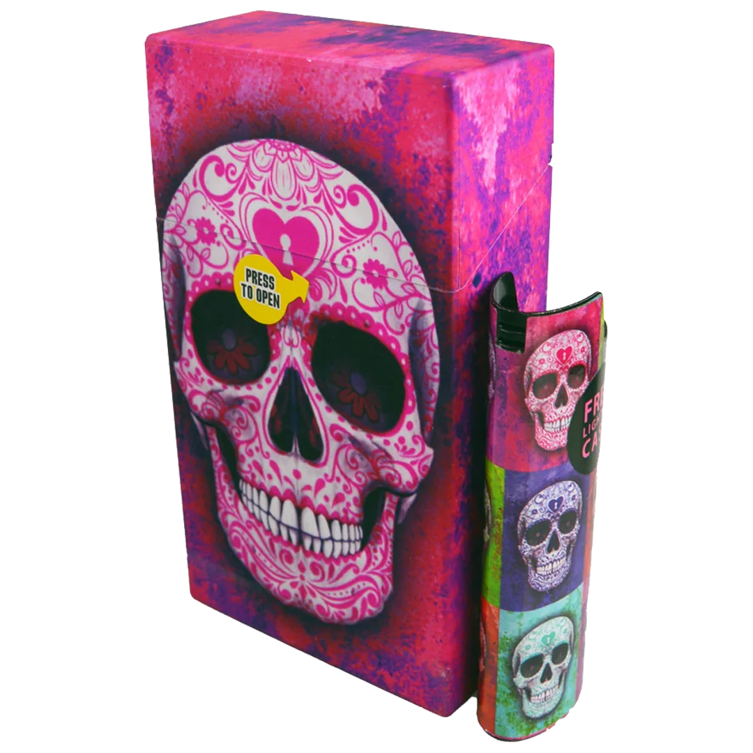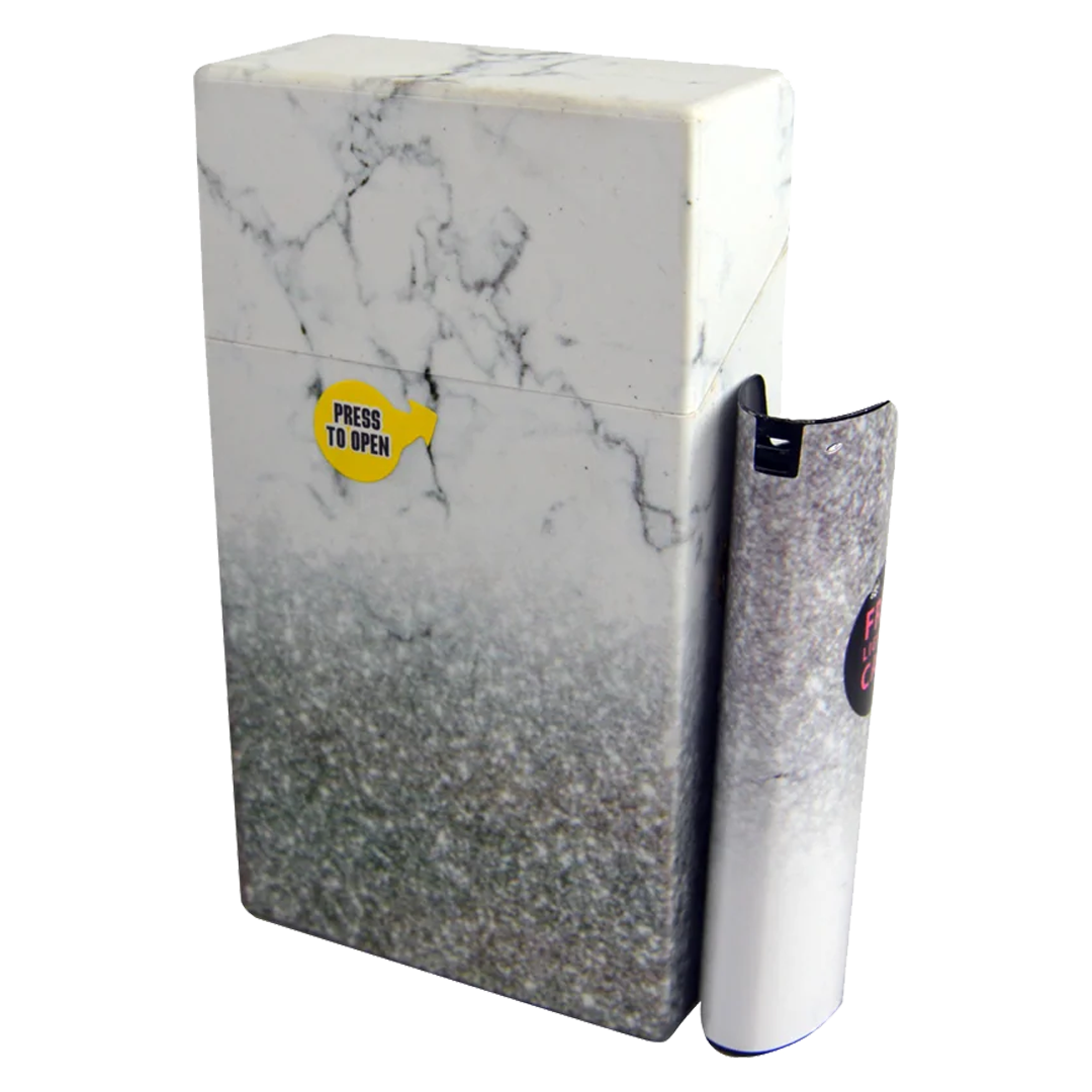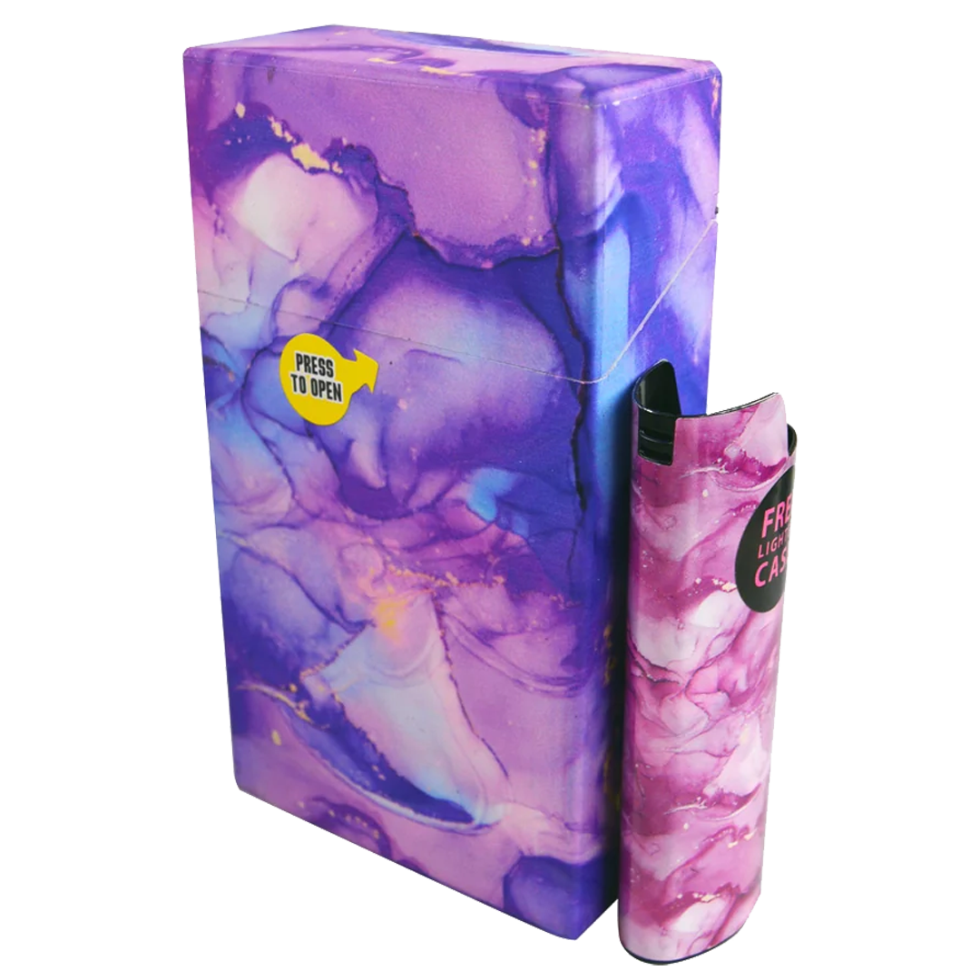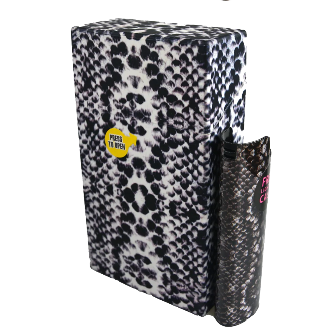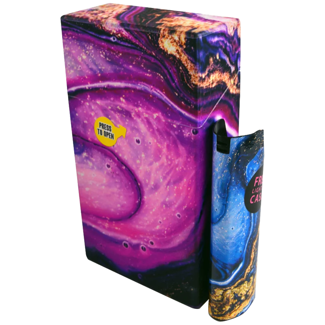 This 100's Flip Top Cigarette & Lighter case is perfect for keeping your cigs safe, storing money, and lots more! Fits 100's sized cigarette boxes. The strong magnets on the side of the cig case keeps the included lighter case together so you won't lose it!