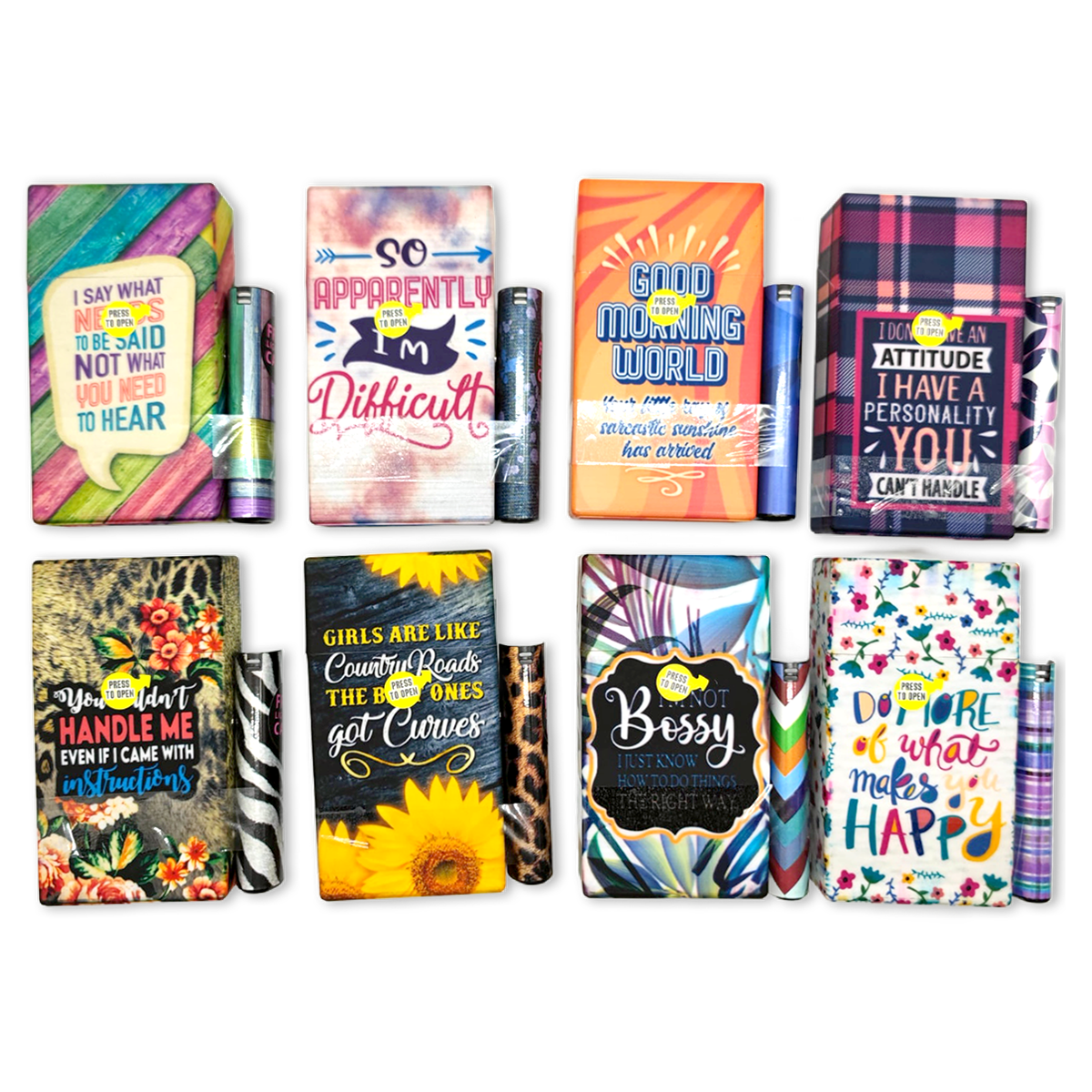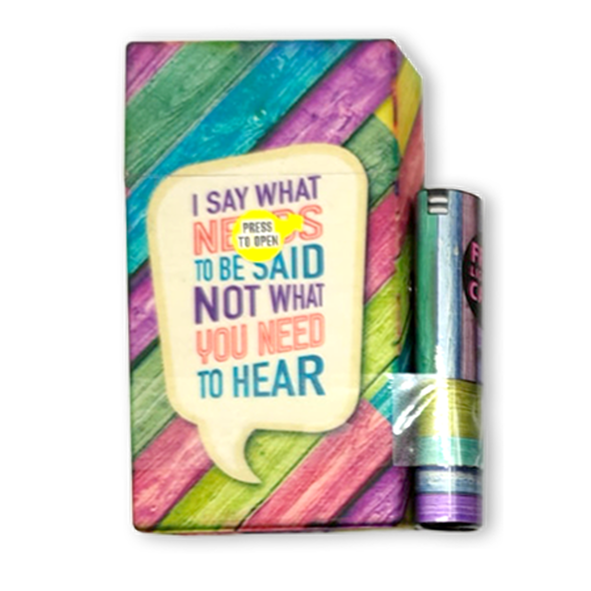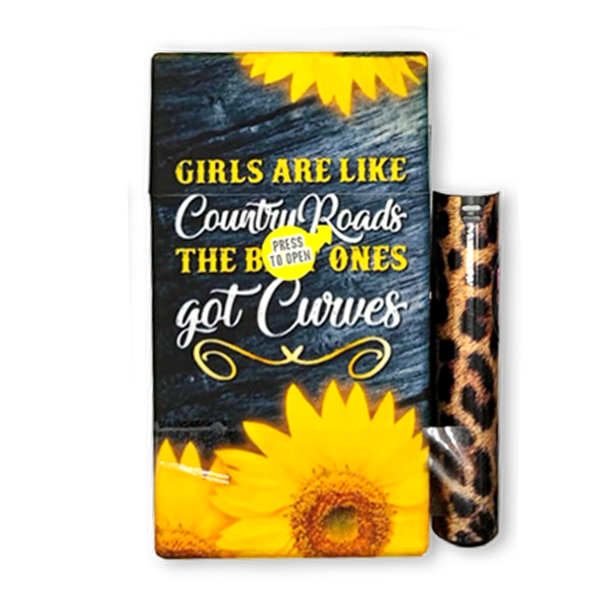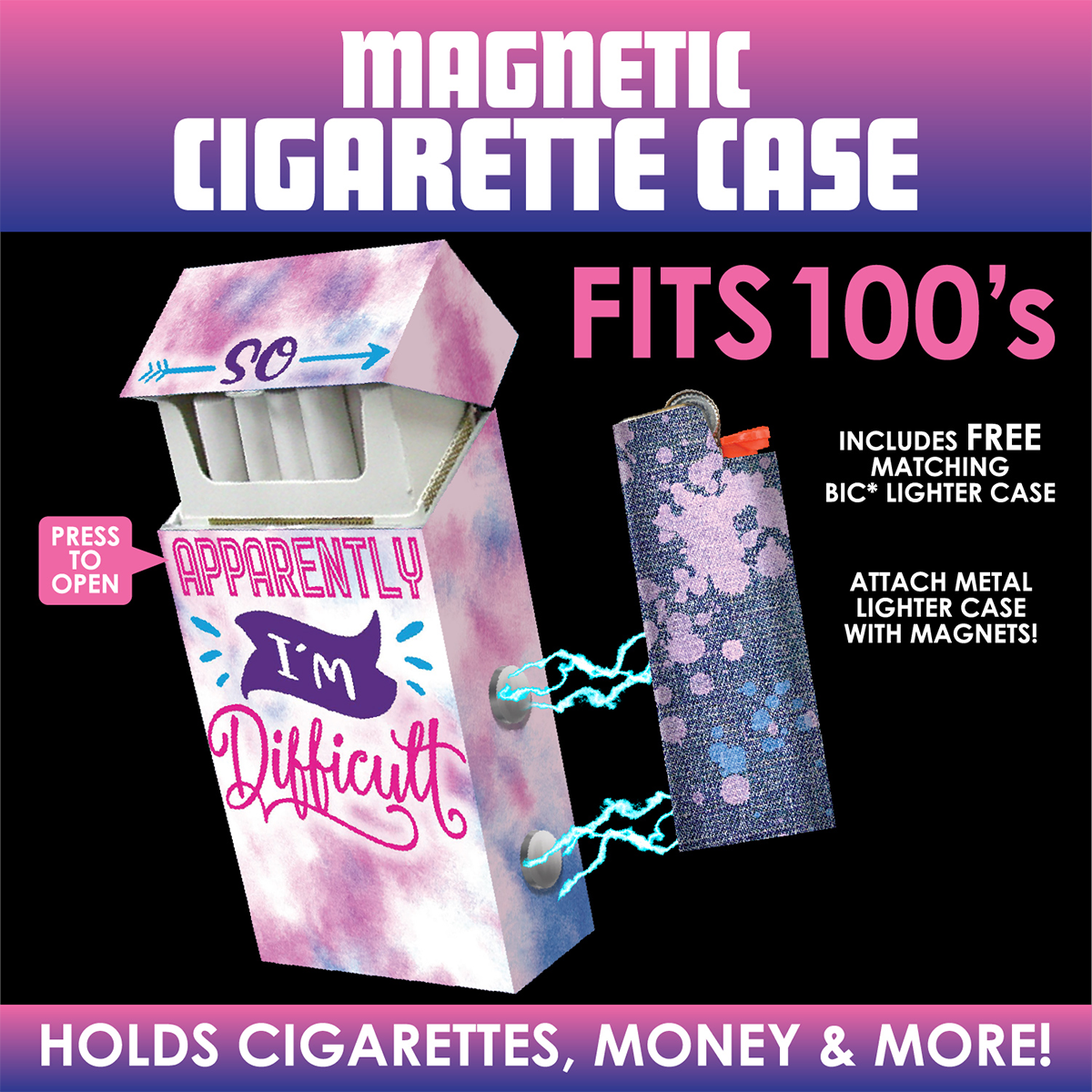 This 100's cigarette lighter case is perfect for keeping your cigs safe, storing money, and lots more! Fits 100's sized cigarette boxes. The strong magnets on the side of the cig case keeps the included lighter case together so you won't lose it!
